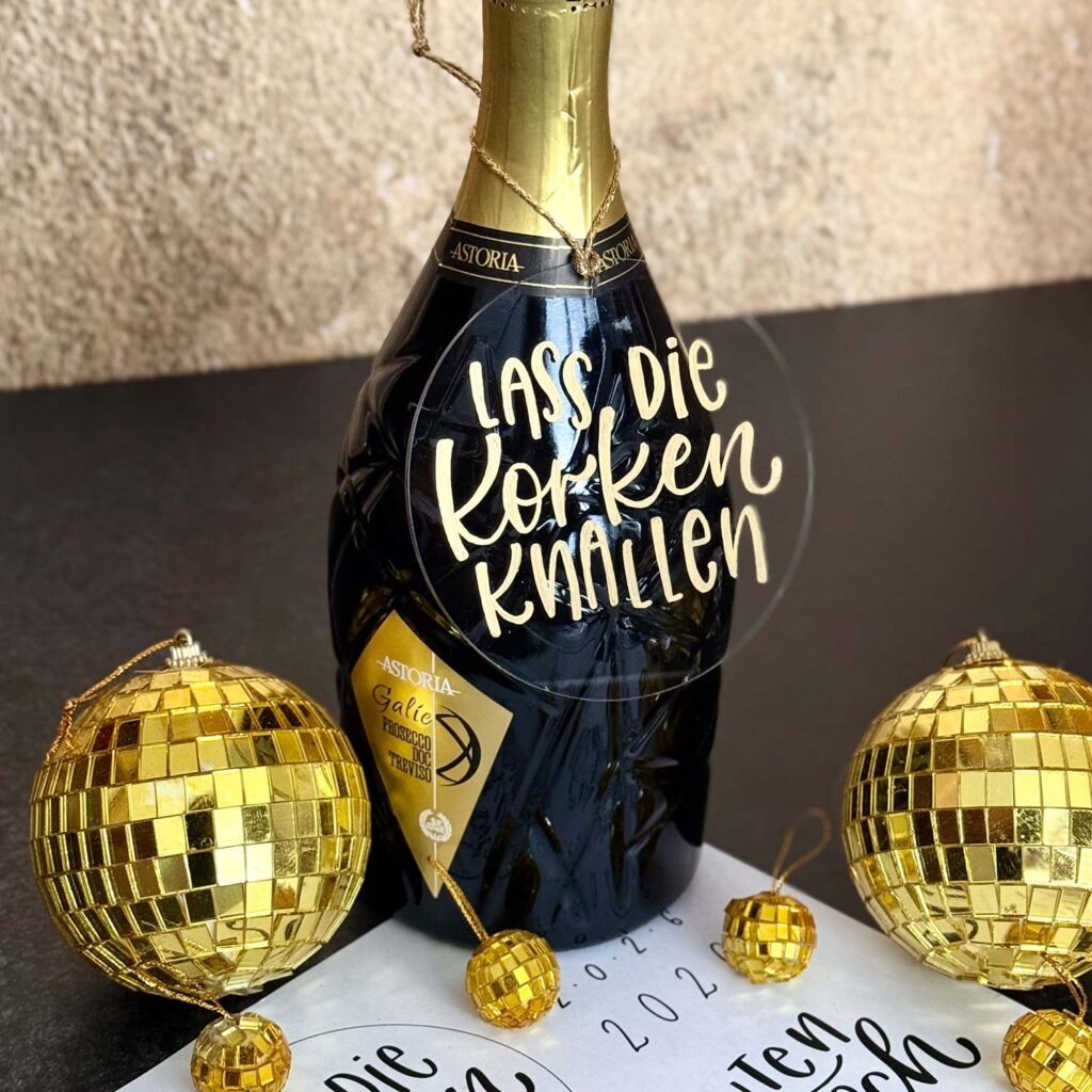 Schneide vom Glitter– und Transparentpapier einen Streifen (ca. 6,5 cm) ab und bestempel das Transparentpapier mit einem Neujahrs-Spruch (z.B. Prosit Neujahr). Stanze am oberen Ende mittig ein Loch mit dem Motivstanzer Kreis. Knicke die Streifen 1-2 cm unter dem Loch, schneide ein Stück vom Transparentpapier schräg ab und hänge es um eine Flasche.