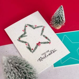 Die Schablone wurde von mir (Isabelle von Ländle Liebelei) entworfen und produziert. Sie passt perfekt auf B6 Klappkarten oder A6-Karten (z.B. Clairefontaine Goldline Aquapad). Male die Tannen mit Metallic-Aquarellfarben (z.B. von Van Gogh oder FINETEC) aus, spachtel sie mit Acrylfarbe aus, für einen 3D-Effek oder verwende Stempel, um den Stern auszufüllen.