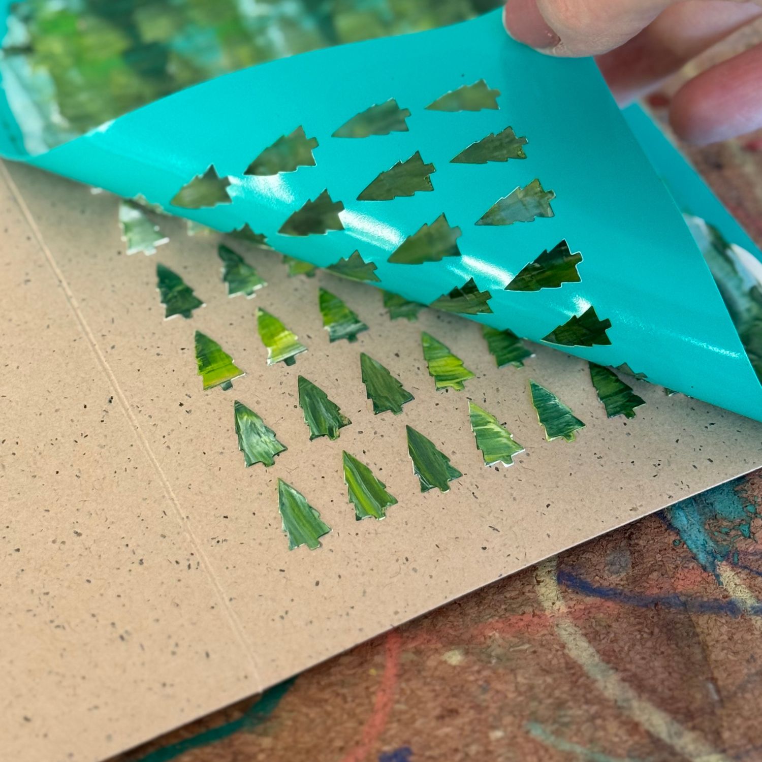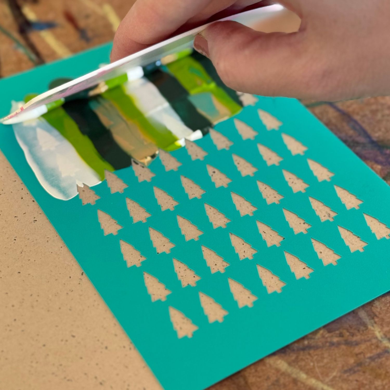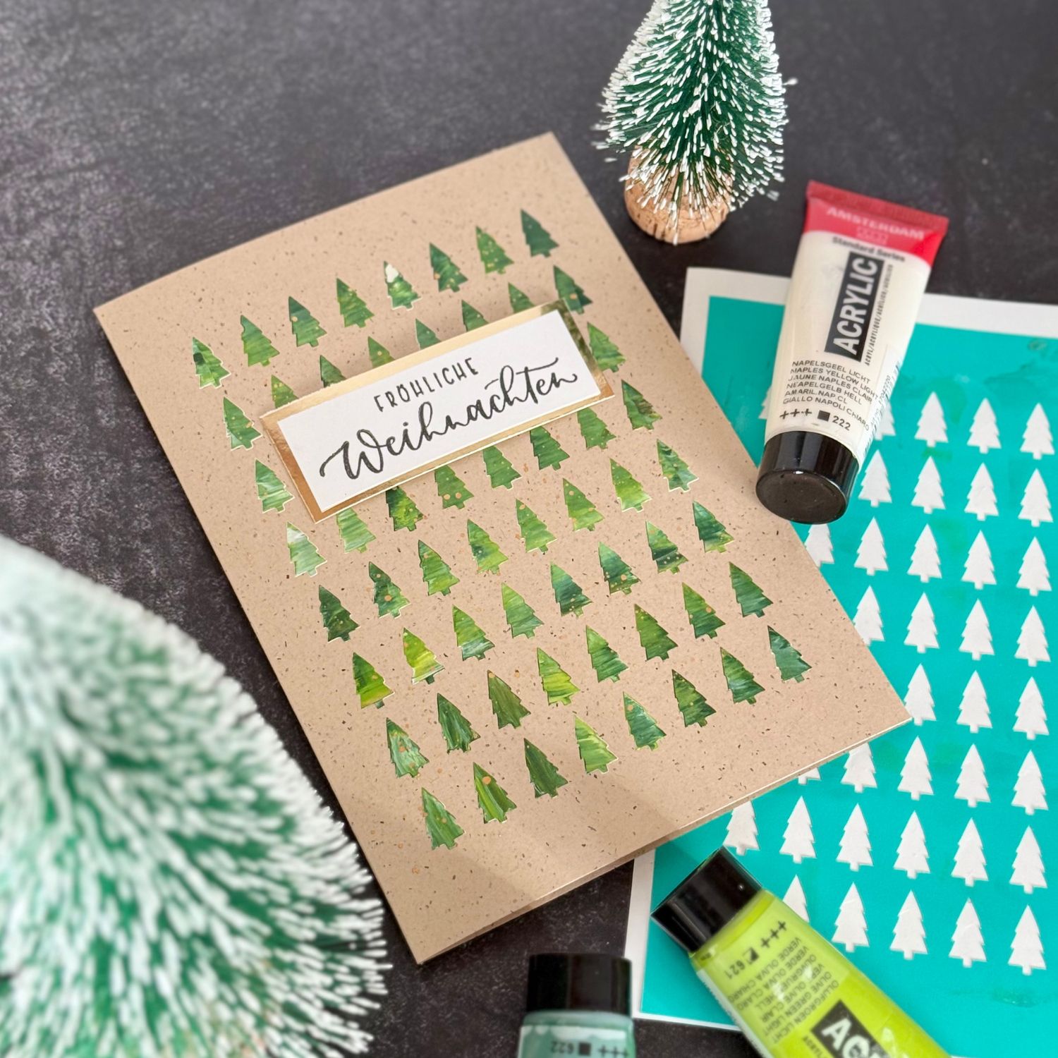 Die Schablone wurde von mir (Isabelle von Ländle Liebelei) entworfen und produziert. Sie passt perfekt auf B6 Klappkarten oder auf A6-Karten (z.B. Clairefontaine Goldline Aquapad). Alle Ländle Liebelei Kreativ-Schablonen eignen sich hervorragend zum Prägen. Male die Tannen mit Metallic-Aquarellfarben (z.B. von Van Gogh oder FINETEC) aus oder spachtel sie mit Acrylfarbe aus, für einen 3D-Effekt.