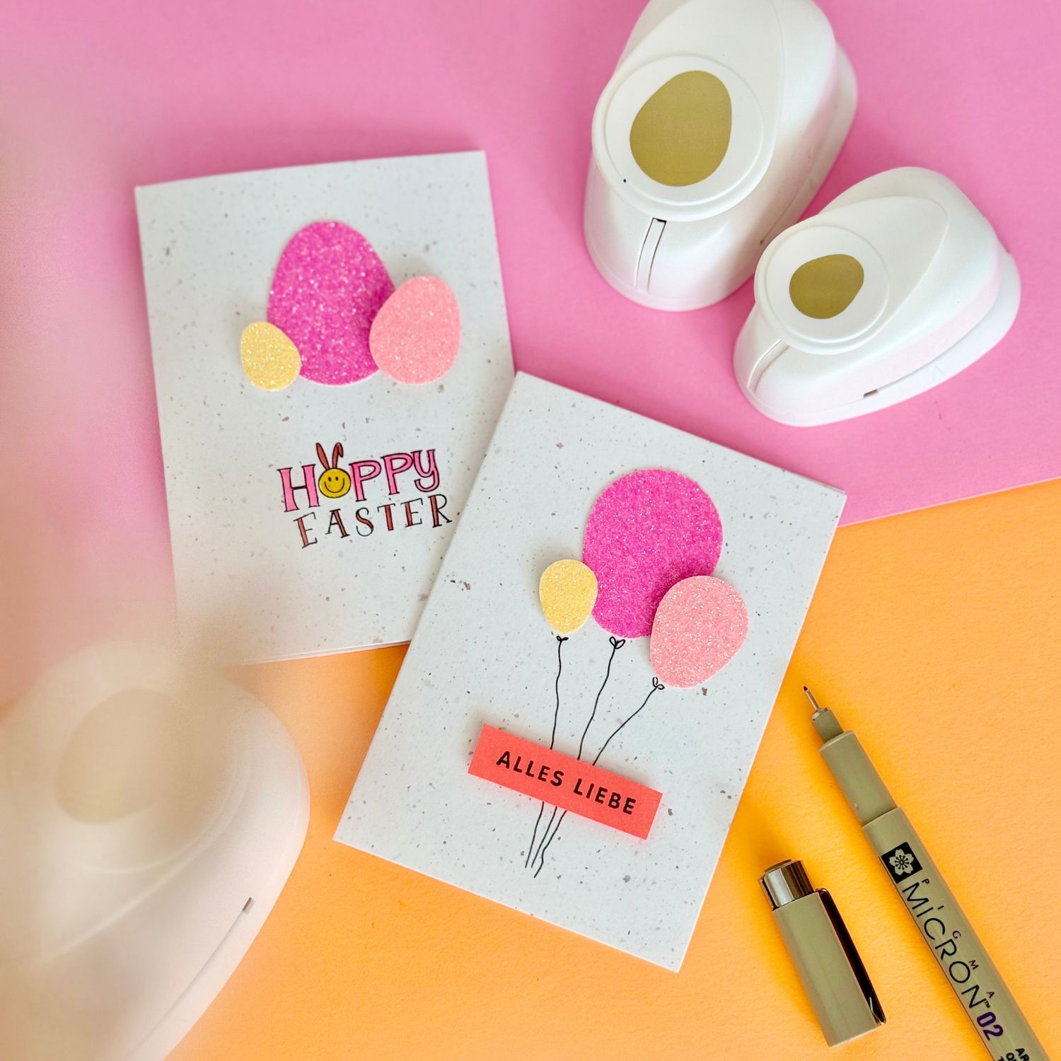 Mit diesem Motivstanzer Set stanzt du mit nur einer Handbewegung Eier (Ø 12, 19 und 37 mm) aus Papier, Tonkarton, Fotos, Kork, dünnen Schaumstoff und mehr. Mit etwas Fantasie werden aus den Eiern auch Luftballons, Kürbisse oder Bienen und somit etliche Ideen für die verschiedensten Anlässe (Geburtstag, Valentins- und Muttertag, Glückwünsche,…). Gestalte daraus Karten (z.B. quadratische Klappkarten Kraftpapier oder Mixed Media) und kombiniere sie mit Stempel.