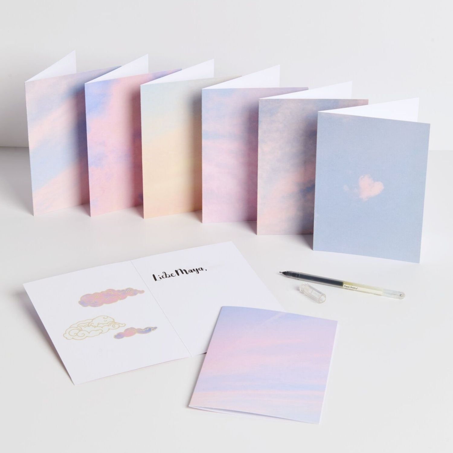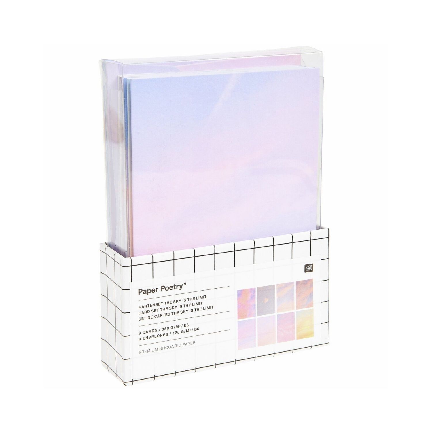 Das paper Poetry Kartenset „The Sky is the Limit“ umfasst acht Klappkarten in acht unterschiedlichen Designs und bietet eine abwechslungsreiche Auswahl für verschieden gestaltete Grüße. Die Karten werden durch acht farblich passende Umschläge im Format B6 ergänzt, sodass jedes Motiv vollständig zur Geltung kommt. Durch die vielfältigen Designs eignet sich das Set sowohl für persönliche Nachrichten als auch für Einladungen oder kleine Anlässe.