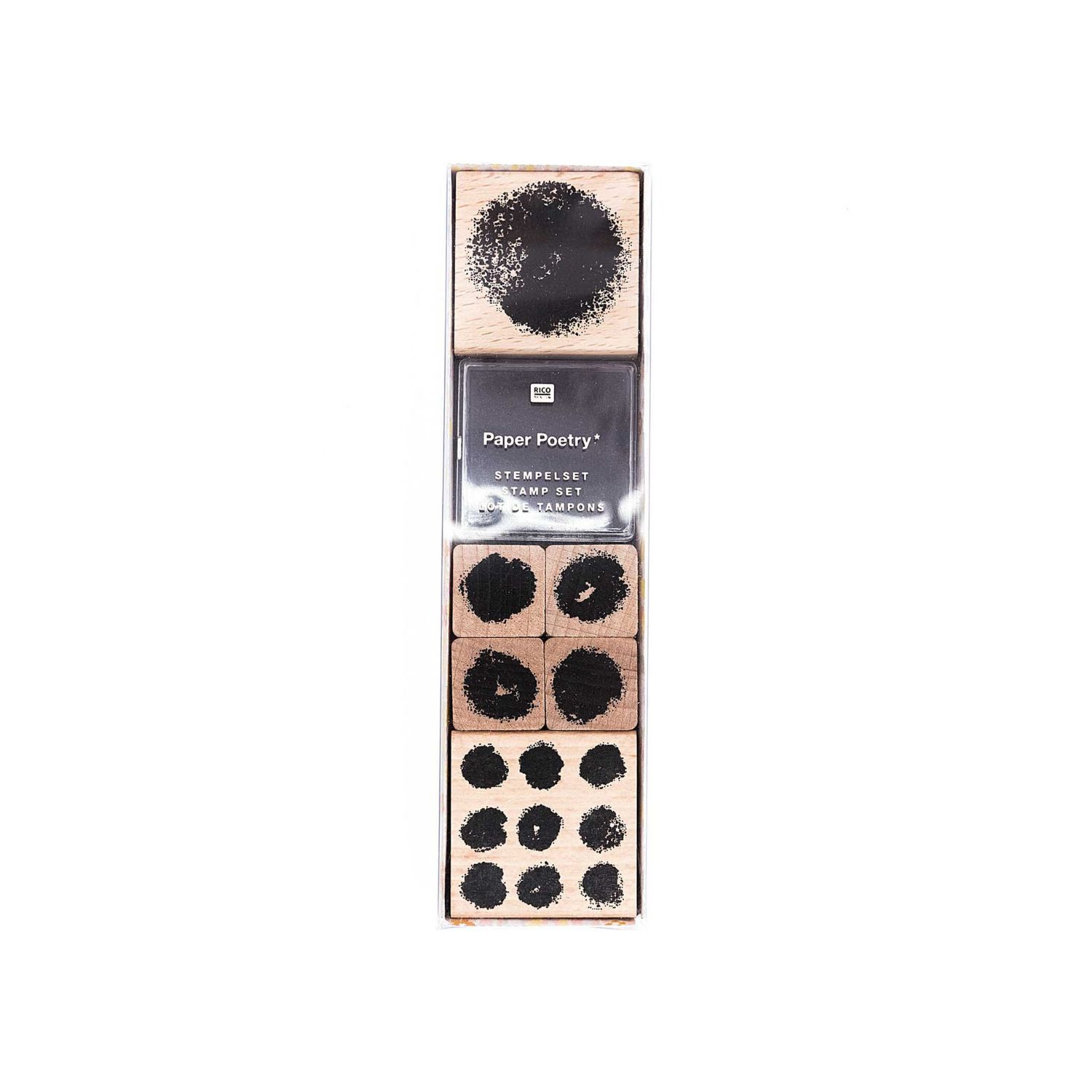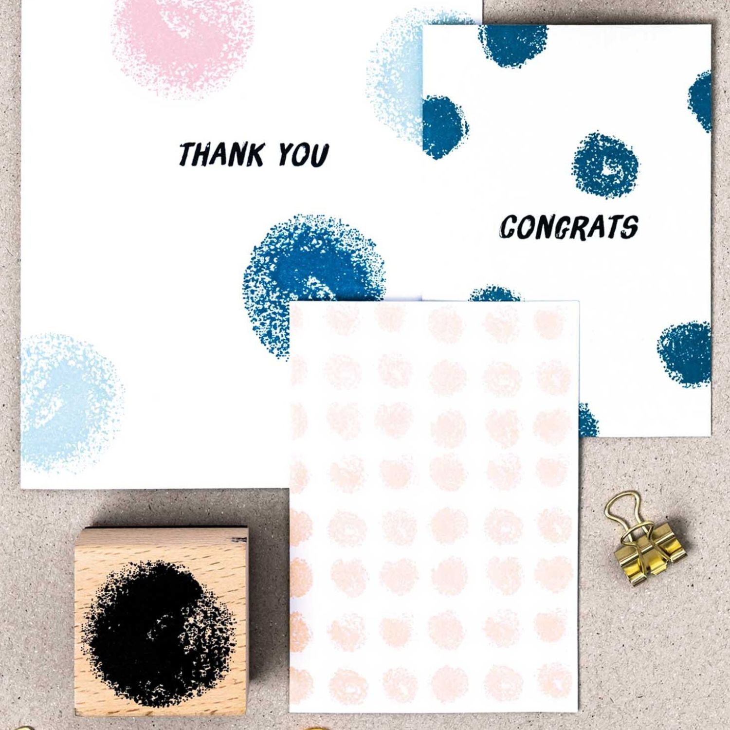 Das Stempelset „Punkte“ enthält 6 Stempel mit abstrakten Punkten und bietet damit zahlreiche Möglichkeiten für kreative Papierprojekte. Perfekt für Hintergründe oder abstrakte Motive! Mit dem enthaltenen schwarzen Stempelkissen kannst du direkt loslegen. Gestalte damit Karten, Geschenkanhänger oder Verpackungen. Mit dem schnelltrocknenden und wasserfesten Stempelkissen von StazOn (in schwarz oder weiß) kannst du auch Wasserschiebefolie bestempeln und damit zum Beispiel Kerzen gestalten.