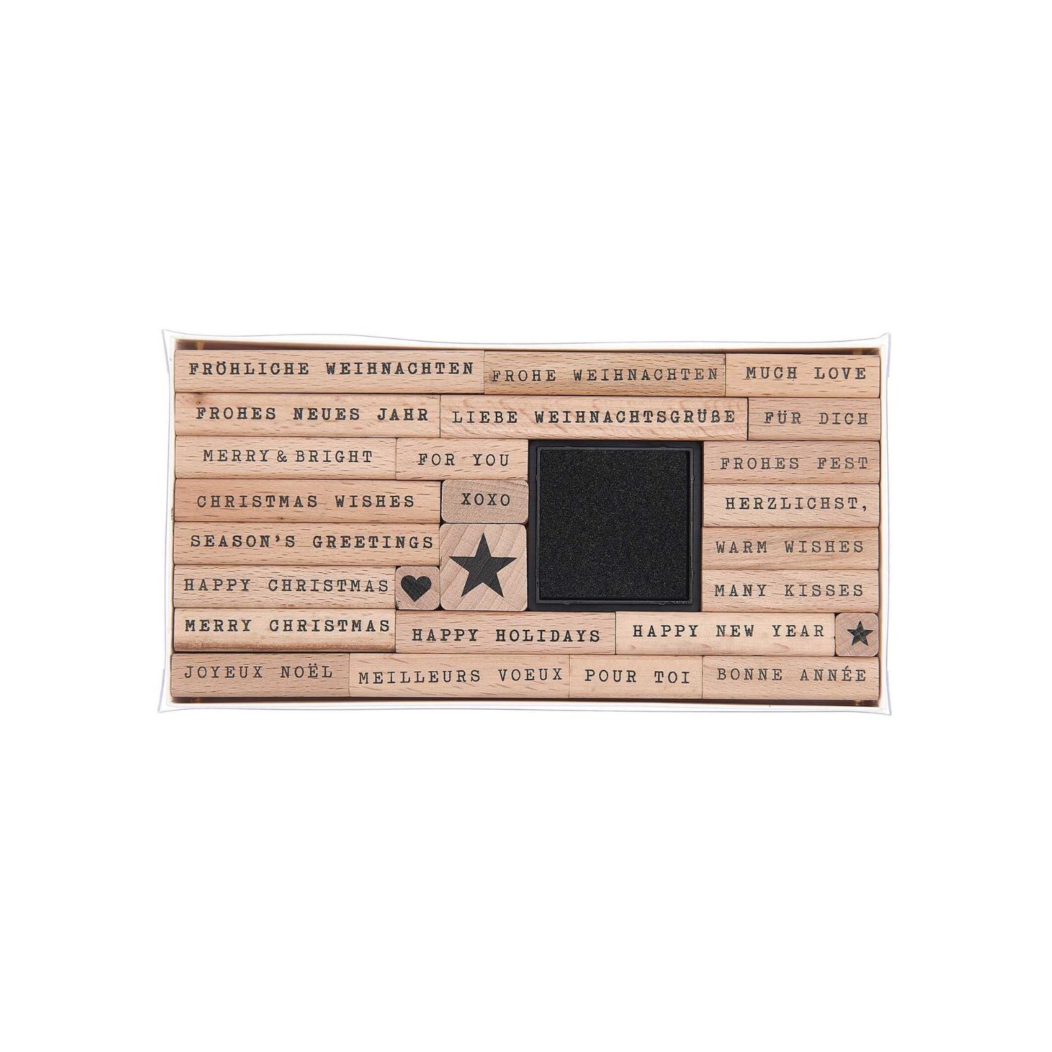 27-teiliges Holzstempelset mit einer Auswahl an weihnachtlichen Texten in unterschiedlichen Größen und Ausführungen. Mit dem enthaltenen schwarzen Stempelkissen kannst du direkt loslegen. Gestalte damit Weihnachtskarten, Geschenkanhänger oder Verpackungen. Mit dem schnelltrocknenden und wasserfesten Stempelkissen von StazOn (in schwarz oder weiß) kannst du auch Wasserschiebefolie bestempeln und damit zum Beispiel Kerzen gestalten.