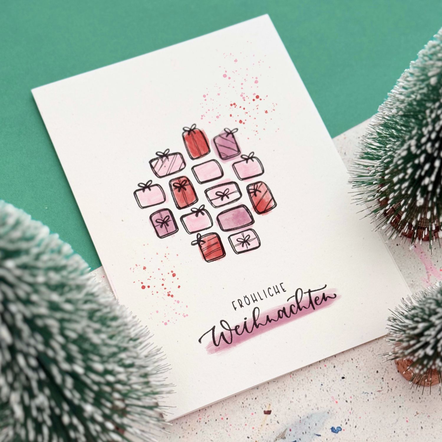 - Motive: Schleifen, Stern, Weihnachtskugeln, Tannenbaum, Tannenzweige, Beeren, Baumständer, Geschenke, Glühbirne, Kerze