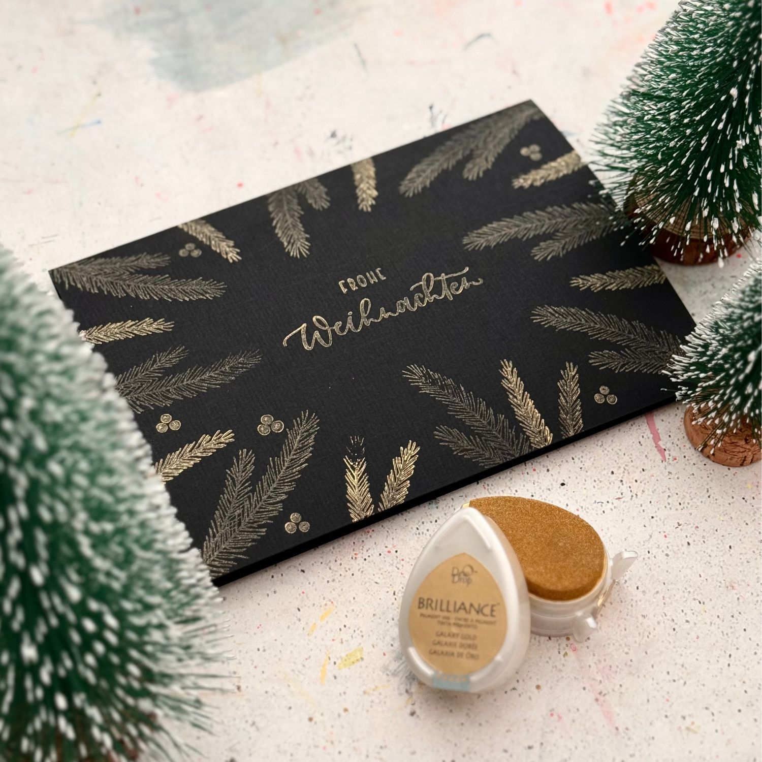 - Trage Tinte auf den Stempel auf (z.B. StazOn Jet Black oder Snowflake)