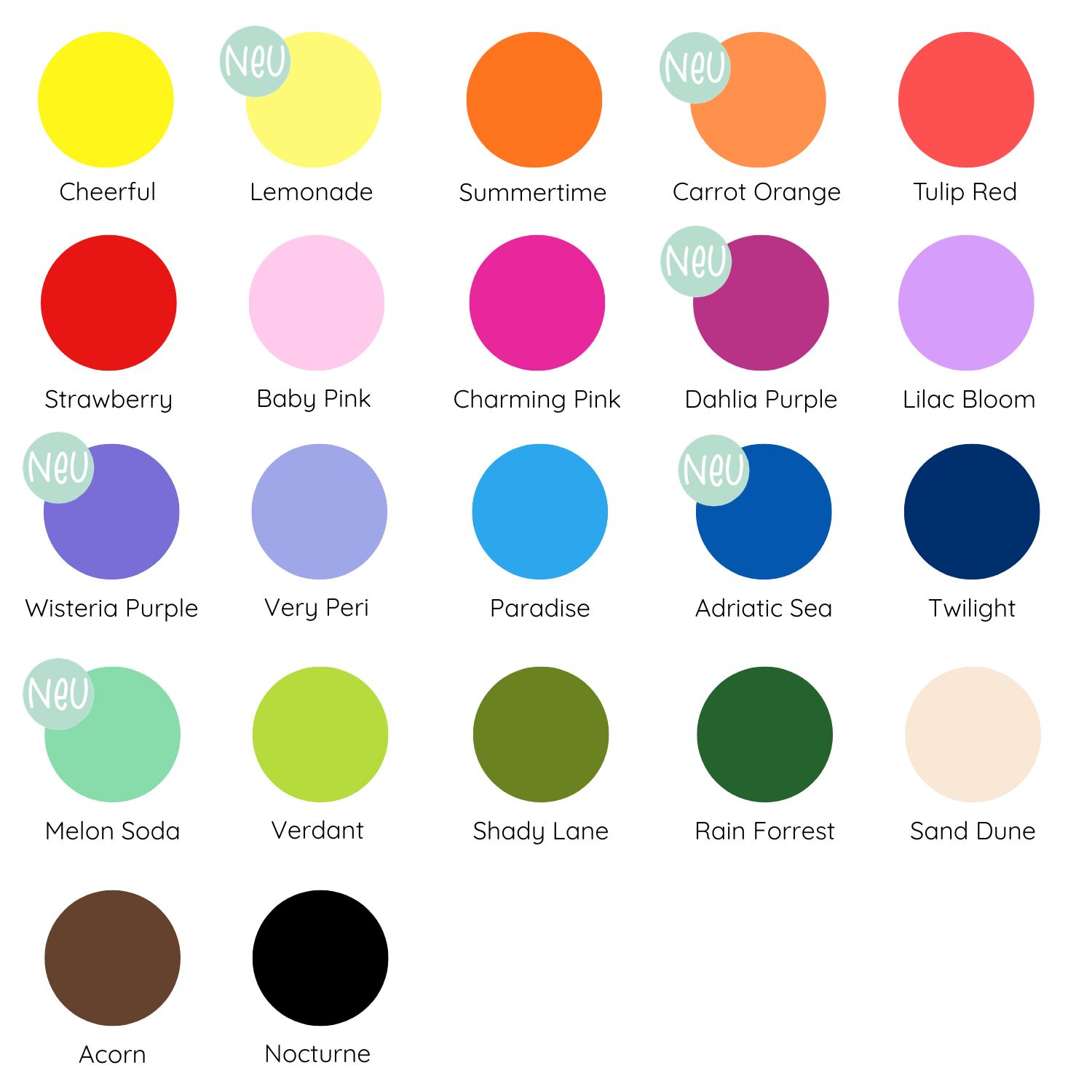 - Farben: Cheerful, Summertime, Tulip Red, Strawberry, Baby Pink, Charming Pink, Lilac Bloom, Very Peri, Paradise, Twilight, Rain Forest, Shady Lade, Verdant, Sand Dune, Acron und Noturne